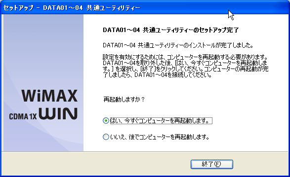 ユーティリティソフトのインストールが完了したら「再起動」をするように言ってきます