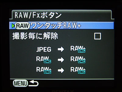 初期値(デフォルト)の設定は、ワンタッチでRAW撮影に切り替える機能になっています